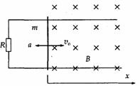(19分) 如图所示,两条互相平行的光滑金属导轨位于水平面内,距离为L= 0.2m,在导轨的一端接有阻值为R=0.5Ω的电阻,在x≥0处有一与水平面垂直的均匀磁场,磁感强度B= 0.5T。一质量为m = 0. lkg的金属直杆垂直放置在导轨上,并以v0 = 2m/s的初速度进入磁场,在安培力和一垂直于杆的水平外力F的共同作用下作匀变速直线运动,加速度大小为a=2m/s2、方向与初速度方向相反。设导轨和金属杆的电阻都可以忽略,且接触良好。求: