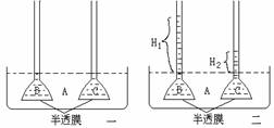 4.下图为渗透作用实验,开始如下图(一),A代表清水,B、C代表蔗糖溶液,过一段时间后结果如下图(二),漏斗管内液面不再发生变化,H1、H2表示漏斗管内液面与清水的高度差。下列说法错误的是[ ]