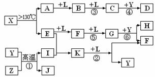 (14分)已知A、E、I、L是常见的非金属单质,其中A为淡黄色固体;Z是常见的金属单质,B的相对分子质量比A大32,C的相对分子质量比B大16,Y是一种常见的液体,J是磁性氧化铁, D、H、K均是重要的化工产品;X分子的球棍模型如图所示,组成X的两种元素的相对原子质量相差18。下列框图中部分反应条件已略去。