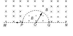(18分)如图所示,直线MN下方无磁场,上方空间存在两个匀强磁场,其分界线是半径为R的半圆,两侧的磁场方向相反且垂直于纸面,磁感应强度大小都为B,现有一质量为m、电荷量为q的带负电微粒从P点沿半径方向向左侧射出,最终打到Q点,不计微粒的重力。求: