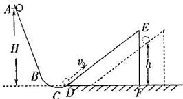 25.如图所示,固定轨道ABCD由斜面轨道AB和圆弧轨道BCD组成,AB与BCD相切于B点.质量M=3kg的三角形木块DEF静置于光滑水平地面上,木块的斜面DE与圆弧BCD相切于D点.质量m=l kg的小球从离地面高H=5.5 m的A点由静止释放,经过D点后以某一速度v0滑上木块的倾斜面DE,自D点经过时间t=1.4s,小球沿DE上升到最大高度h=4.2 m.若小球从A点运动到D点过程中阻力做功W=-5J,取g=1 0m/s2.求: