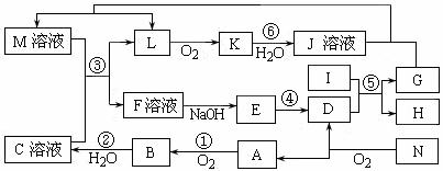 27.(14分)下图是无机物A ~ N在一定条件下的转化关系(部分产物及反应条件未列出)。M的溶液与C的稀溶液发生以下反应。其中,I的单质能与本周期IA、VIIA元素组成的最高价氧化物的水化物分别发生反应,K是一种红棕色气体,E.是红褐色的物质,N是由两种元素按质量比7∶8组成的常用化工原料。