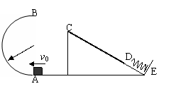(20分)如图所示,半圆形光滑轨道竖直固定,半径R=0.1m,其右侧一定水平距离处固定一个斜面体。斜面C端离地高度h=0.15m,E端固定一轻弹簧,原长为DE,斜面CD段粗糙而DE段光滑。现给小物块(可看作质点)一个水平初速v0,从A处进入圆轨道,离开最高点B后恰能落到斜面顶端C处,且速度方向恰平行于斜面,物块沿斜面下滑压缩弹簧后又沿斜面向上返回,第一次恰能返回到最高点C。物块与斜面CD端的动摩擦因数μ=