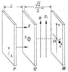 (22分)如图所示,竖直放置的P、Q平行金属板间存在着水平向右的匀强电场, PQ间距L,Q板正中有一水平小孔S正对着右侧正方形屏上的O点,O点位于屏的正中央,屏的边长大小为a,以O点为坐标原点建立如图直角坐标系,x轴水平,y轴竖直。Q板与屏间距为