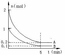 (2)、在一定温度下,向容积为2L的密闭容器中加入2molA和1molB,反应过程中A和B的物质的量随时间的变化关系如上右图所示。该反应在5min内的反应速率是 (以A计算)。该反应的平衡常数为 。