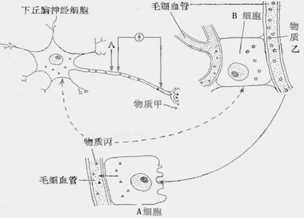 (1)如果A细胞为甲状腺细胞,则物质甲分泌后将进入 运输并最终作用于图中的