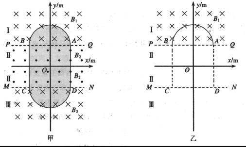 处以相同的速度发射相同的粒子,请在Ⅱ和Ⅲ区城内重新设计适当的匀强电场或匀强磁场,使粒子运动的轨迹成为上、下对称的“8”字,且粒子运动的周期跟甲图中相同,请通过必要的计算和分析,求出你所设计的“场”的大小、方向和区域,并在答题卡本题的乙图中描绘出带电粒子的运动轨迹和你所设计的“场”。(上面半圆轨迹已在图中画出)