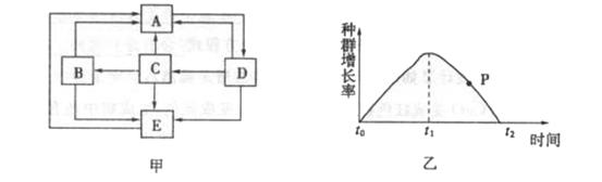 (18分)图甲为某草原生态系统的结构简图,“→”表示碳的流动方向。图乙为某植食性昆虫迁入该生态系统后的种群数量增长率变化曲线。