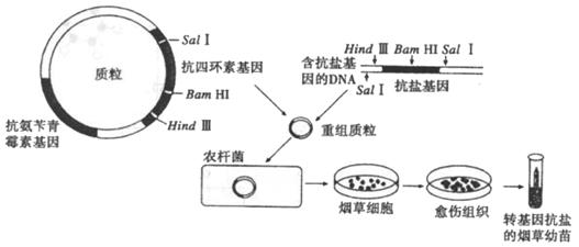 某质粒上有SalⅠ、HindⅢ、Bam HI三种限制酶切割位点,同时还含有抗四环素基因和抗氨苄青霉索基因。利用此质粒获得转基因抗盐烟草的过程如图所示,请回答下列问题。