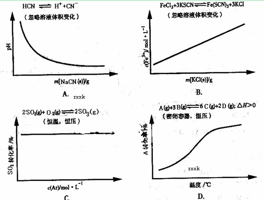 12、某强酸性反应体系中,反应物和生成物共六种物质:PbO2、PbSO4 (难溶盐)、Pb(MnO4)2(高锰酸铅强电解质)、H2O、X(水溶液呈无色)、H2SO4,已知X是一种盐,且0.1molX在该反应中应失去3.01×1023个电子。下列说法中不正确的是( ) A、若有9.8gH2SO4参加反应,则转移电子的物质的量为1mol B、该反应的化学方程式为:5PbO2 + 2MnSO4 + 2H2SO4=== Pb(MnO4)2 + 4PbSO4 + 2H2O C、Pb(MnO4)2既是氧化产物又是还原产物 D、X是MnSO4 13、各可逆反应达平衡后,改变反应条件,其变化趋势正确的是