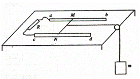 如图所示,相距为l 的光滑平行金属导轨ab 、cd 放置在水平桌面上,阻值为R 的电阻与导轨的两端a 、c相连。滑杆MN质量为m ,垂直于导轨并可在导轨上自由滑动,不计导轨、滑杆以及导线的电阻。整个装置放于竖直方向的范围足够大的匀强磁场中,磁感应强度的大小为B 。滑杆的中点系一不可伸长的轻绳,绳绕过固定在桌边的光滑轻滑轮后,与另一质量也为m 的物块相连,绳处于拉直状态。现将物块由静止释放,当物块达到最大速度时,物块的下落高度