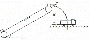 ,传送带的主动轮和从动轮半径相等,主动轮轴顶端与运煤车底板间的竖起高度H = 1.8 m ,与运煤车车箱中心的水平距离x = 1.2m 。现在传送带底端由静止释放一些煤块(可视为质点),煤块在传送带的作用下先做匀加速直线运动,后与传送带一起做匀速运动,到达主动轮时随轮一起匀速转动。要使煤块在轮的最高点水平抛出并落在车箱中心,取g = 10 m/s2,sin37°=0.6 , cos37°= 0.8 ,求: