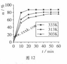 B(OCH3)3+3H2O中,H3BO3的转化离(α)在不同温度下随反应时间(t)的变化见图12,由此图可得出: