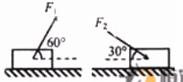 如图所示,一物体置于水平地面上。当用水平方向成60°角的力F1时,物体做直线运动:当改用与水平方向成30°角的力F2拉物体时,物体仍做匀速直线运动。若F1 和F2的大小相等,则物体与地面的之间的摩擦因数为[B]