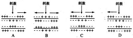 18、在一条离体神经纤维的中段施加电刺激,使其产生兴奋。下列图中能正确表示刺激时的膜内外电位变化和所产生的神经冲动的传导方向的是( )