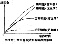 动物细胞体外培养时,通常要在培养基中补充一定浓度的某些物质。右图是血清对正常细胞和癌细胞培养影响的实验结果。从该图提供的信息可以获得的正确结论有( )