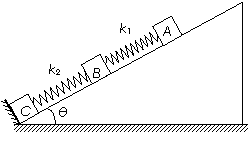 24.(18分)如图所示,在倾角为θ的光滑斜面上放有三块小物块,劲度系数为k1的轻质弹簧两端分别与质量为m1和m2的物块A、B拴接,劲度系数为k2的轻质弹簧两端分别与质量为m2和m3的物块B、C拴接,物块C紧靠挡板,整个系统处于平衡状态.现施力将物块A缓慢沿斜面向上拉,直到物块C刚脱离挡板.重力加速度为g,求