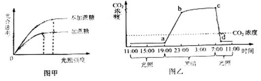 (2)图乙是试管苗在密闭、无糖培养基条件下测得的24h内CO2浓度变化曲线。图中b-c段CO2浓度升高缓慢是因为_________ _____,c-d段CO2浓度急剧下降是因为试管苗___________。若d点时打开培养瓶塞,试管苗的光合速率_____。
