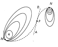 如图“嫦娥一号”卫星在地球轨道近地点M经历三次加速变轨后,由地月转移轨道进入月球轨道,然后又在月球轨道近月点N经历三次近月制动,最后进入工作轨道,P是转移轨道上的一点,直线AB过P点且和两边轨道相切。下列有关“嫦娥一号”卫星的说法正确的是