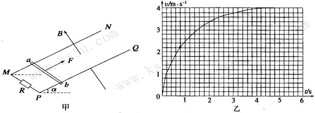 的电阻,其它电阻不计,质量m=2.0 kg的金属杆ab垂直导轨放置,如图甲所示.用恒力F沿导轨平面向上拉金属杆ab,由静止开始运动,v-t图象如图乙所示,g = 10 m/s2,导轨足够长.求: