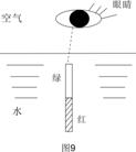 12.如图9所示,在一清澈平静的水池中竖着放置一根双色细棒,棒的上部分为绿色,下