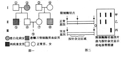 (7分)人的肤色正常与白化病受基因A和a控制,正常人与镰刀型细胞贫血症患者受基因B和b控制,两对基因分别位于两对常染色体上。假设白化病基因与相对应的正常基因相比,缺失了一个限制酶的切点。下图图一表示某家族遗传系谱图,图二表示甲、乙、丙3人白化基因或相对应正常基因的核酸分子杂交诊断结果示意图。据图回答下列问题。
