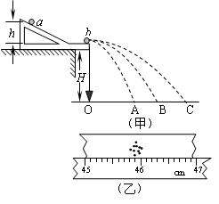 某同学用下图(甲)所示的装置做验证动量守恒定律的实验.先将a球从斜槽轨道上某固定点处由静止开始滚下,在水平地面的记录纸上留下压痕,重复10次;再把同样大小的b球放在斜槽轨道末端水平段的最右端附近静止,让a球仍从原固定点由静止开始滚下,和b球相碰后,两球分别落在记录纸的不同位置处.重复10次.