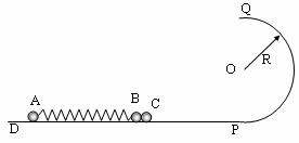 15.如图所示,光滑轨道的DP段为水平轨道,PQ段为半径是R的竖直半圆轨道,半圆轨道的下端与水平的轨道的右端相切于P点。一轻质弹簧两端分别固定质量为2m的小球A和质量为m的小球B,质量为m小球C靠在B球的右侧。现用外力作用在A和C上,弹簧被压缩(弹簧仍在弹性限度内)。这时三个小球均静止于距离P端足够远的水平轨道上。若撤去外力,C球恰好可运动到轨道的最高点Q。已知重力加速度为g .求: