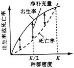 下图表示出生率、死亡率和种群密度的关系,据此分析得出的正确表述是