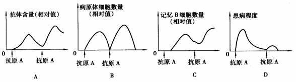 人体免疫反应是机体识别“自己”、排除“异己”的过程,在这一过程中发生了一系列的变化。下列有关曲线中,不能正确反映这一变化过程中某些因素变化情况的是 ( )