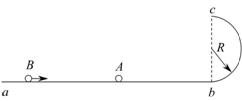 (18分)如图,abc是光滑的轨道,其中ab是水平的,bc为与ab相切的位于竖直平面内的半圆,半径R=0.30 m。质量m=0.20 kg的小球A静止在轨道上,另一质量M=0.60 kg、速度