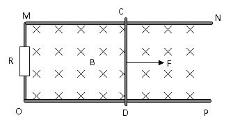 36.(18分)如图所示,电阻不计的平行金属导轨MN和OP放置在水平面内。MO间接有阻值为R=3Ω的电阻.导轨相距d=lm,其间有竖直向下的匀强磁场,磁感强度B=0.5T。质量为m=0.1kg,电阻为r=lΩ的导体棒CD垂直于导轨放置,并接触良好,现用平行于 MN的恒力F=1N向右拉动CD,CD受摩擦阻力f恒为0.5N。求: