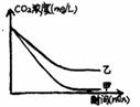 利用红外测量仪可以灵敏地测量密闭小室(容积为1L)中的CO2浓度变化。在两个密闭小室中分别放置叶面积都是10cm2的甲、乙两种植物的叶片,在充足的光照条件下进行测量,根据结果绘制草图如右,据此推测