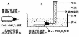 ②将4片圆形小滤纸片在肝脏研磨液浸泡后取出,并贴在反应室上侧的内壁上(如图A);