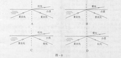13.由红光和紫光组成的复合光束,从某种介质射到介质和真空的界面后,光的路径可能是下面图-8中的 ( )