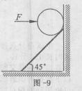 的斜面固定于竖直墙上,为使质量分布均匀的光滑球体静止在如图一9所示的位置,需用一个水平推力F作用于球上,F的作用线通过球心。设球受到重力为G,竖直墙对球的弹力为N1,斜面对球的弹力为N2,则下列说法正确的是 ( )