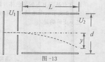 19.图一13是示波管的工作原理图:电子经电场加速后垂直于偏转电场方向射入偏转电场,若加速电压为U1,偏转电压为U2,偏转电场的极板长度与极板间的距离分别为L和d,y为电子离开偏转电场时发生的偏转距离。取“单位偏转电压引起的偏转距离”来描述示波管的灵敏度,即
