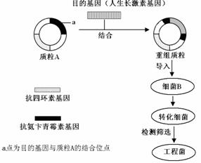 下图是将人的生长激素基因导入细菌细胞B制造工程菌的示意图。已知细菌细胞B不含质粒A,也不含质粒A上的基因。质粒A导入细菌细胞B后,其上的基因能得到表达。请回答下列问题