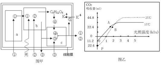 Ⅰ.下图甲是腊梅绿色植物细胞代谢过程示意图(图中数字代表物质,a、b、c代表细胞器),图乙是该植物置于密闭容器内1小时CO2的变化曲线图(标准状况)。