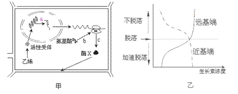 (1)下图甲表示乙烯促进离层细胞合成和分泌酶X的过程,酶X能够水解离层细胞的细胞壁导致叶柄脱落。图乙表示叶柄离层细胞两侧(近基端和远基端)的生长素浓度与叶片脱落关系。