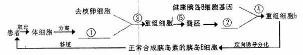 下图是利用现代生物工程技术治疗遗传性糖尿病(基因缺陷导致胰岛B细胞不能正常合成胰岛素)的过程设计图解,清据图回答: