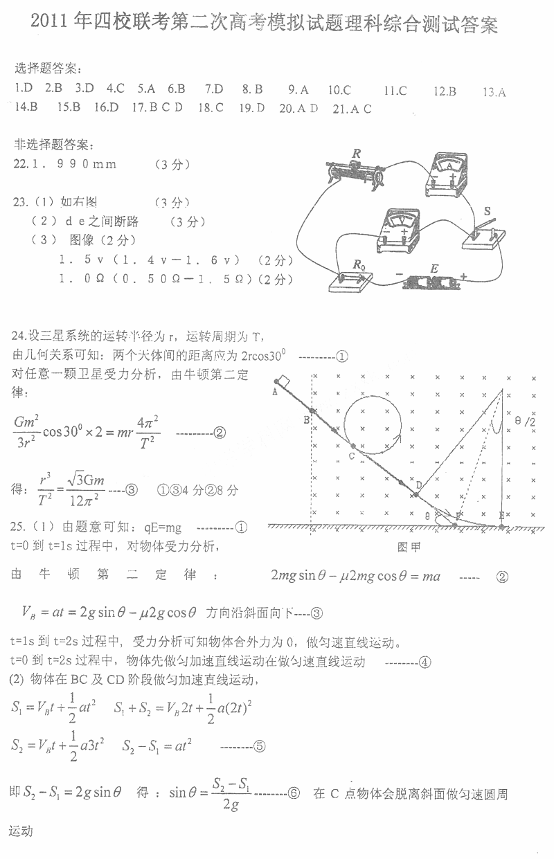 (2)质量为m2=1.5Skg的平板车B停放在光滑的水平面上,左端静止着一块质量为m1= 450g的物体A,一颗质量为m0= 50g的子弹以v0=100m/s的速度水平瞬间射人物体A在并留在A中,平板车B足够长。求物体A与平板车B 间因摩擦产生的热量。