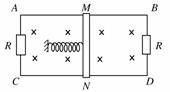 21.如右图所示,AB、CD为两个平行的水平光滑金属导轨,处在方向竖直向下、磁感应强度为B的匀强磁场中. AB、CD的间距为L,左右两端均接有阻值为R的电阻.质量为m长为L且不计电阻的导体棒MN放在导轨上,与导轨接触良好,并与轻质弹簧组成弹簧振动系统.开始时,弹簧处于自然长度,导体棒MN具有水平向左的初速度v0,经过一段时间,导体棒MN第一次运动到最右端,这一过程中AC间的电阻R上产生的焦耳热为Q,则