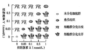 (3)在再分化阶段所用的培养基中,含有植物激素X和植物激素Y,逐渐改变培养基中这两种植物激素的浓度比,未分化细胞群的变化情况如下图所示,据图指出两种激素的不同浓度比与形成芽、根、愈伤组织的关系: