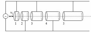 24(18分).如图所示是一直线加速器原理的示意图,由K个长度逐个增大的共轴金属圆筒排列成一串(图中只画了5个作为示意),奇数筒和偶数筒分别连接到频率为f、最大电压值为U的正弦交流电源的两极(设圆筒内部没有电场),整个装置放在真空容器中,圆筒的两底面中心开有小孔。带电粒子从粒子源出发后,经过第一次加速,然后进入第一个圆筒,再向前运动。相邻两圆筒间的间隙很小,问: