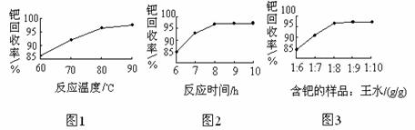 (4)钯的回收率高低主要取决于王水溶解的操作条件,已知反应温度、反应时间和王水用量对钯回收率的影响如图1-图3所示,则王水溶解钯的适宜条件是:反应温度为