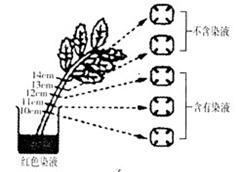 (2)水对植物的新陈代谢也具有十分重要的作用。为了研究水分在植物体内的运输,某生物兴趣小组做了如下实验:将紫苏的枝条放在盛有红色染液的烧杯中,一段时间后,洗净并在距离枝条底部的不同位置横切观察导管部分(如图)含有染液的部分显示水分经过的途径和高度。分析回答: