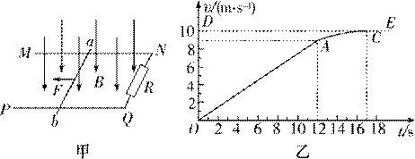 24.(20分)如图甲所示,空间存在B=0.5T,方向竖直向下的匀强磁场,MN、PQ是处于同一水平面内相互平行的粗糙长直导轨,间距L=0.2m,R是连接在导轨一端的电阻,ab是跨接在导轨上质量为m=0.1kg的导体棒.从零时刻开始,通过一小型电动机对ab棒施加一个牵引力F,方向水平向左,使其从静止开始沿导轨做加速运动,此过程中棒始终保持与导轨垂直且接触良好.图乙是棒的v-t图象,其中OA段是直线,AC是曲线,小型电动机在12s末达到额定功率P=4.5W,此后保持功率不变.除R外,其余部分电阻均不计,g=10m/s2.