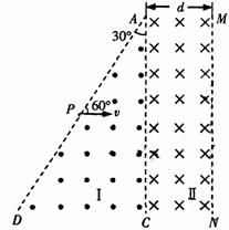 沿纸面与边界AD成600的图示方向从左边进入I区域磁场(粒子的重力可忽略不计).