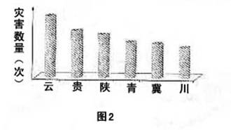 图2为某年中国发生地质地貌灾害次数最多的6个省级行政区。读图,回答第2题。